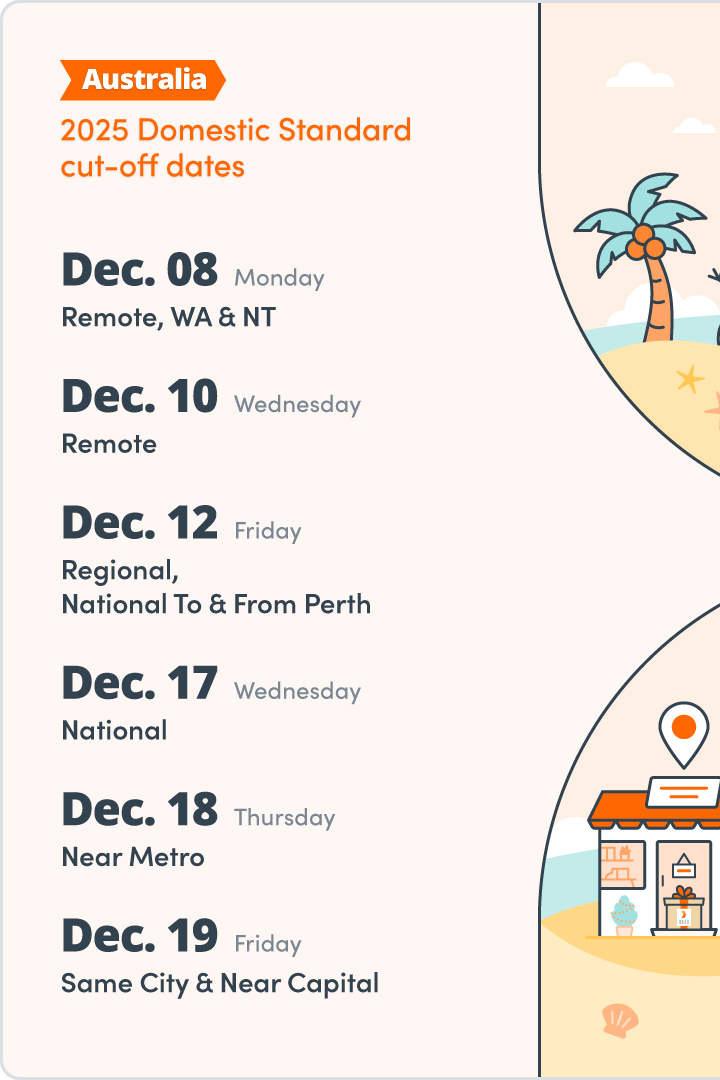 For Sendle, refer to the image. For Australia Post, check out the cut off dates on their website. Orders are shipped from Newcastle, NSW which is treated as a metro area for most services.